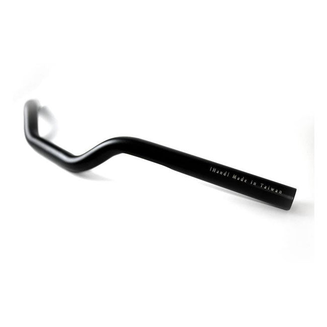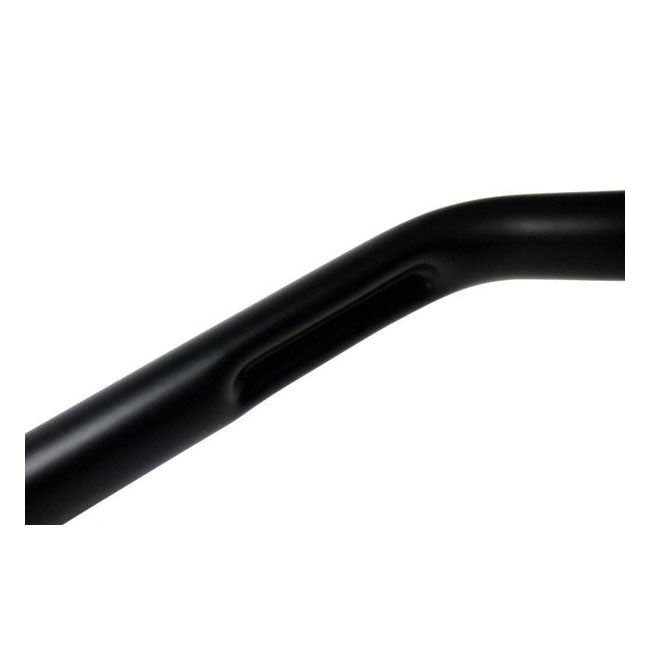 1" diameter, compatible with electronic throttle (TBW = Throttle By Wire). Approx. dimensions: 29.5" wide x 2.2" high x 4.5" pullback. Drilled for stock H-D wiring. Designed as an agressive street riding bar. Matte black powder coated finish.