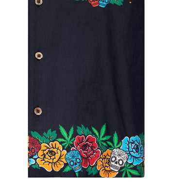 Ay, caramba! This King Kerosin Hawaiian shirt is a real hit for fans of Mexican vibes, retro art, and funky looks. The large-scale print combines a señorita motif with skull blossoms, burning chili peppers, and a nod to tattoo tradition and a touch of Acapulco gold for the truly relaxed. Thanks to the regular fit, lapel collar, and wooden button placket, the cut is as relaxed as your next summer evening. The lightweight fabric ensures a comfortable fit, whether at the beach, a barbecue, or a festival. If you want to stand out, you can't go wrong with this shirt!