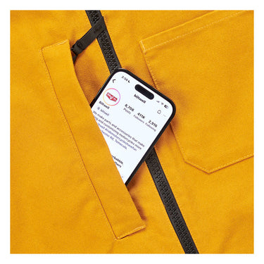 The Biltwell 4-Speed Vest is a robust piece of motorcycle gear, designed with a 13 oz. 100% cotton canvas exterior for durability. It features flexible 3" wide canvas accordion side panels made from a blend of nylon and elastane, providing a comfortable fit. An oversized hidden pocket on the right chest with an 8-inch vertical zipper offers additional storage, while the interior boasts two patch pockets, one with an elastic loop for securing keys. The interior liner is breathable, made from a mix of polyester and Repreve, and features a sublimated graphic for added style.