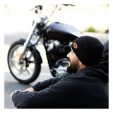 Comfortable and traditional solid knit Biltwell Oval beanie features quad-seam construction with roll-up cuff and embroidered oval Biltwell logo. Made of 100% acrylic and is one-size-fits-most.