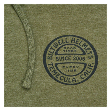 Biltwell was getting bored with black t-shirts and hoodies and thought this heather olive-drab was a great color. The surfy "since 2006" logo is understated printed with water-based inks so it doesn’t feel like a big sticker. This blank is standard-fit, medium-weight pullover hoodie and is perfect for any season. Woven tag on waistband and tear-away sizing labels inside. Made of 8.5 oz., 80/20 cotton/ polyester blend fleece with 100% cotton face.