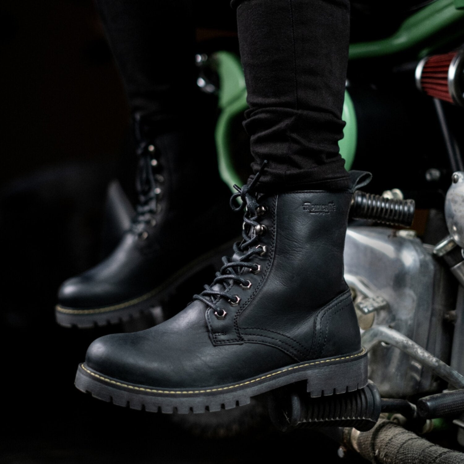 The Trip Machine Derby boots have been the most popular boots. The reinforcements in the toe; heel and ankle are robust and we have increased the gauge of the leather by 2 mm to improve abrasion resistance. The footbed is constructed from a memory foam to provide better comfort. The boots are still constructed from waxed leather with a metallic shank; and a texon insole; to give you the confidence to go anywhere. These boots are lined with lycra and leather to give the best comfort for long time wear with metal hardware finished in antique gold; the boots provide a blend of durability; luxury and style. The sole is an extremely light weight which makes these one of the lightest motorcycles boots out there.